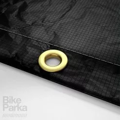 Jeder BikeParka sitzt auf allen Fahrrädern leicht anders, um verschiedene Rahmen, Lenker und Sitzhöhen zu erlauben. Um den BikeParka anzupassen, leg die Abdeckung zuerst unter das Vorderrad, und ziehe sie dann zurück über das Fahrrad. Danach kann der BikeParka bei Bedarf mit dem Toggle noch fester gezogen werden. An der Unterkante des Überzugs sind außerdem stabile Metallösen eingenäht, falls der Überzug für längere Zeit am Bike gesichert werden soll.