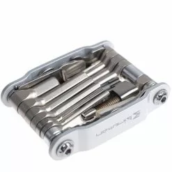 Der Birzman Feexman E20 beinhaltet ein komplettes Sortiment an Innensechskantschlüsseln in verschiedenen Größen sowie einen T25-Torx, für die meisten Vorbauten die gängigste Größe. Schlitz- und Kreuzschraubendreher sind ebenso dabei wie verschiedene Speichenschlüssel, Kettennieter, Reifenheber, Disc-Adjuster sowie Messer (beziehungsweise Mini-Säge) und Flaschenöffner. Die Werkzeuge sind im Detail:
